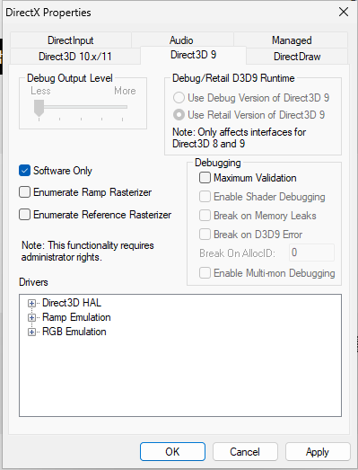 DirextX Control Panel을 실행한 뒤 Direct3D 9 탭에서 Software Only를 체크합니다.