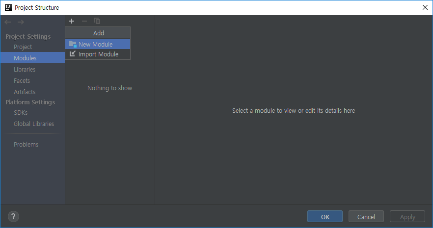 그후 Eclipse의 Project와 같은 개념인 Module을 추가합니다.