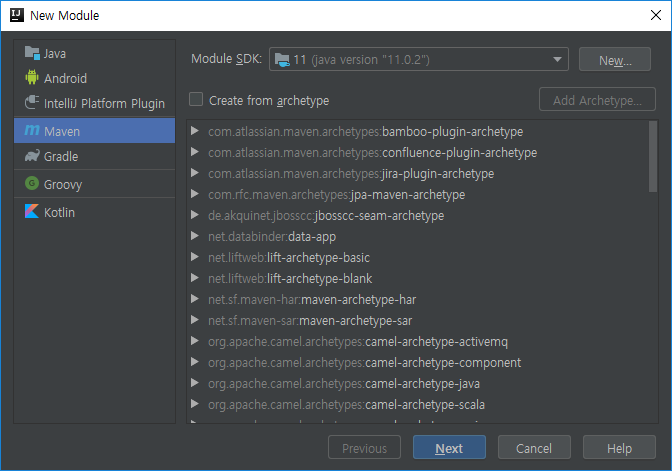 저의 경우에는 Maven 프로젝트를 하기 위해 타입을 "Maven"으로 선택하겠습니다.