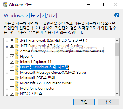 그 후, "Linux용 Windows 하위 시스템"을 선택합니다.