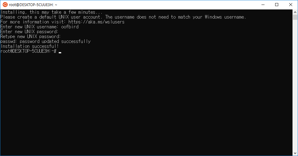 Ubuntu의 명령을 실행할 수 있는 터미널이 실행되며, 사용할 계정/비밀번호를 입력한 뒤 시작할 수 있습니다.