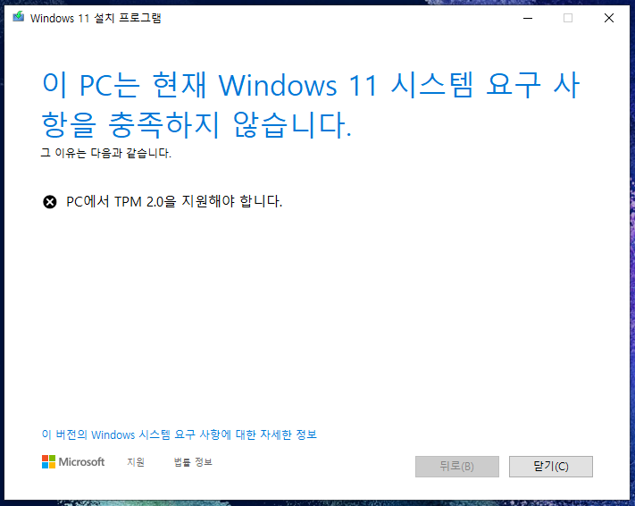 부트캠프를 활용하여 Windows 10을 설치한 상태이며 Windows 11로 업그레이드를 하려고 하면 다음과 같은 오류가 발생합니다.