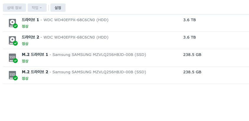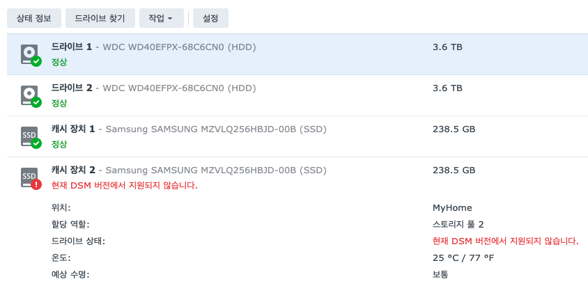 DS720+ 모델에서 NVMe SSD를 캐시가 아닌 파티션으로 사용하고 있었습니다. (비공식)